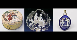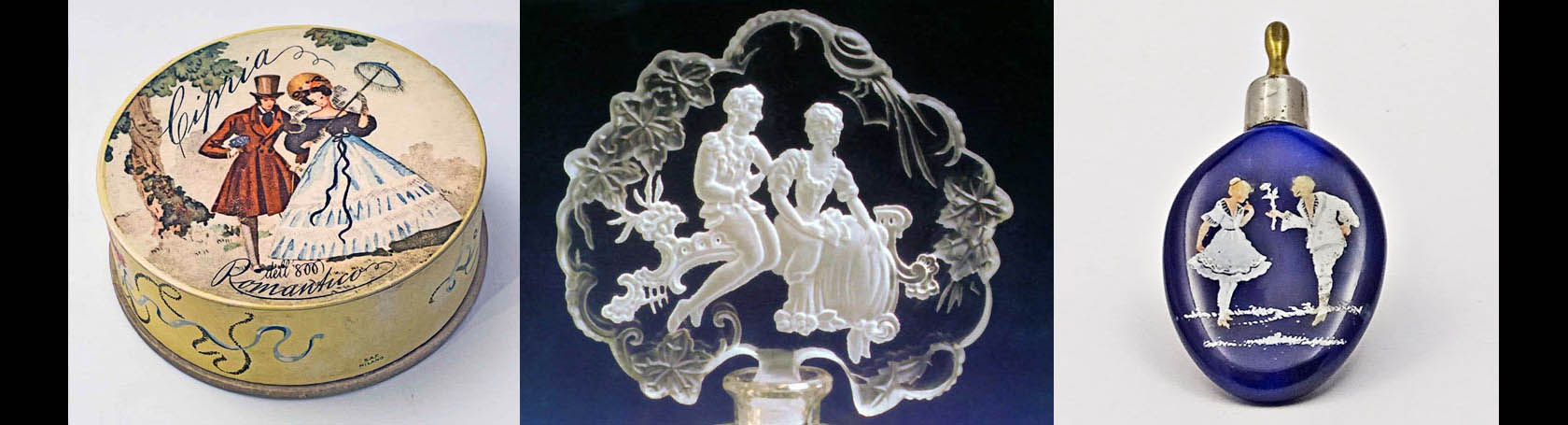 Instead of the traditional Valentines theme, this February we’re looking at a related theme: Courting Couples! Those romantic images of couples walking, talking, dancing, and even sharing passionate embraces. Since perfumes, powders, lipsticks and other vanity items are often used to attract someone, it’s no wonder that images of courting couples are used in advertising these products! And undoubtedly the images on Victorian and Czech items sat on a woman’s vanity table feeding her daydreams …