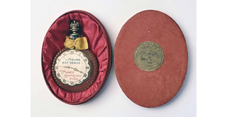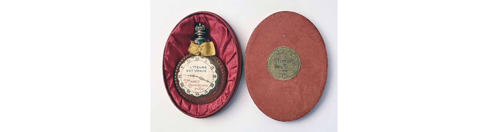 What is the one thing that we never have enough of? (Other than not enough perfumes, compacts, purses or vanity items …) TIME! So perhaps it’s not surprising that a number of perfume and vanity items have used the theme of time (and hours) in their fragrance names, presentations and advertising. Not only do images of clocks, pocket watches and hourglasses abound, but actual working timepieces show up in unexpected places!