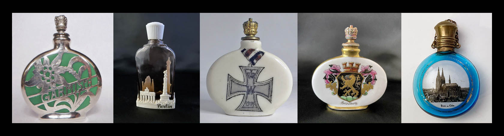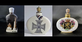 If you travel to Germany, you might want to pick up a souvenir perfume, perfume lamp, or powder jar. Germany had many porcelain factories as well as glassmakers and perfumeries. You might find a unique item from Jean Marie Farina, Mulhens 4711, a German swirl and stripe bottle, a German blown glass novelty, or even a German crown top bottle. Although there are too many of the these in our Virtual Museum to include on this page, IPBA members can follow the preceeding links to see those collections in our Virtual Museum.